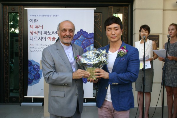 세계다문화박물관 김윤태 관장이 이란 대사관 하산 타헤리안 대사에게 이란전시 개최에 대한 감사패를 전달하고 있다.![]()