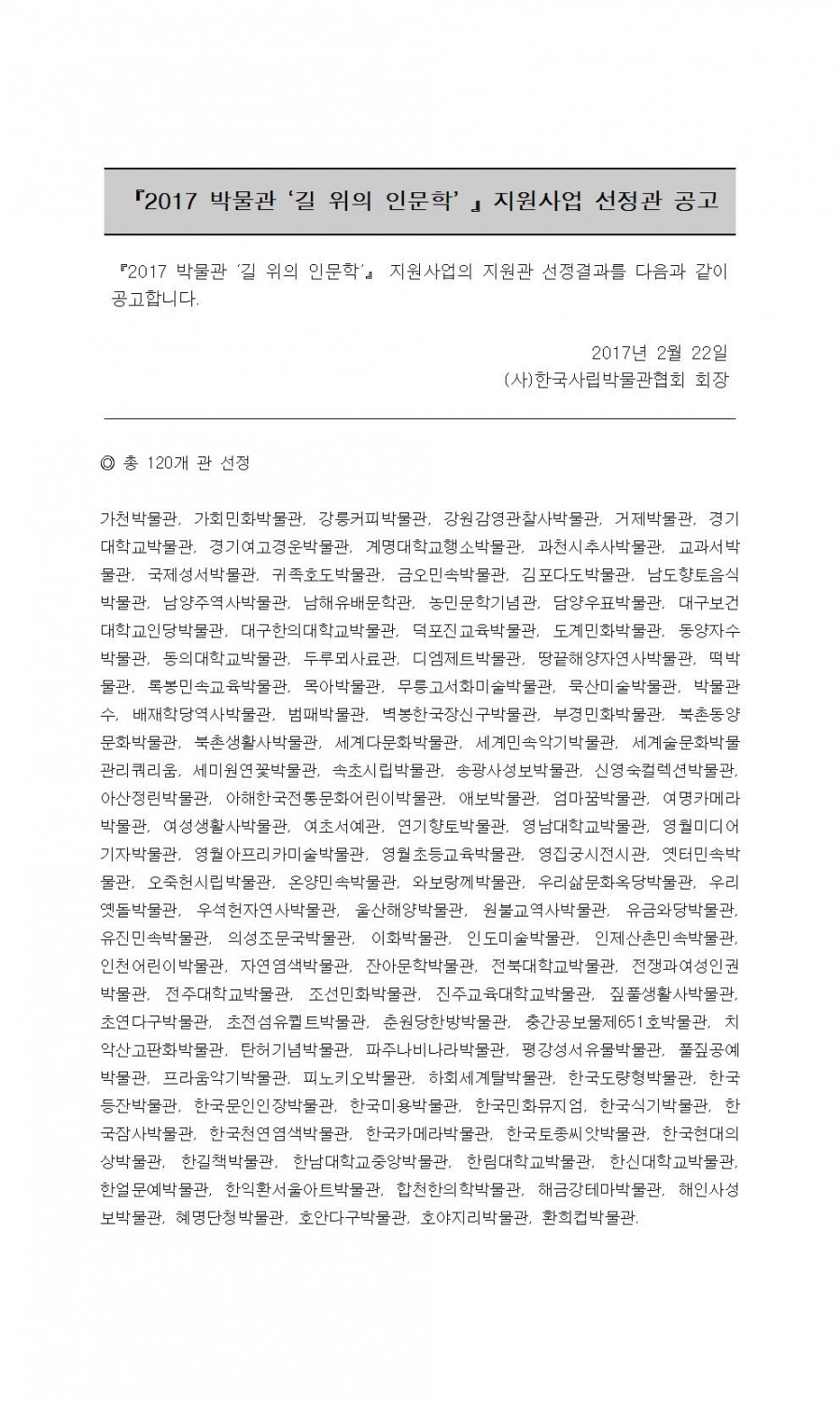 2017 박물관 길 위의 인문학 지원사업 선정관 발표 페이지 정보 작성자 관리자 작성일17-02-22 20:00 조회42,450회 댓글0건 관련링크 이전글 다음글 목록 본문 댓글목록 등록된 댓글이 없습니다. 이전글 다음글 목록