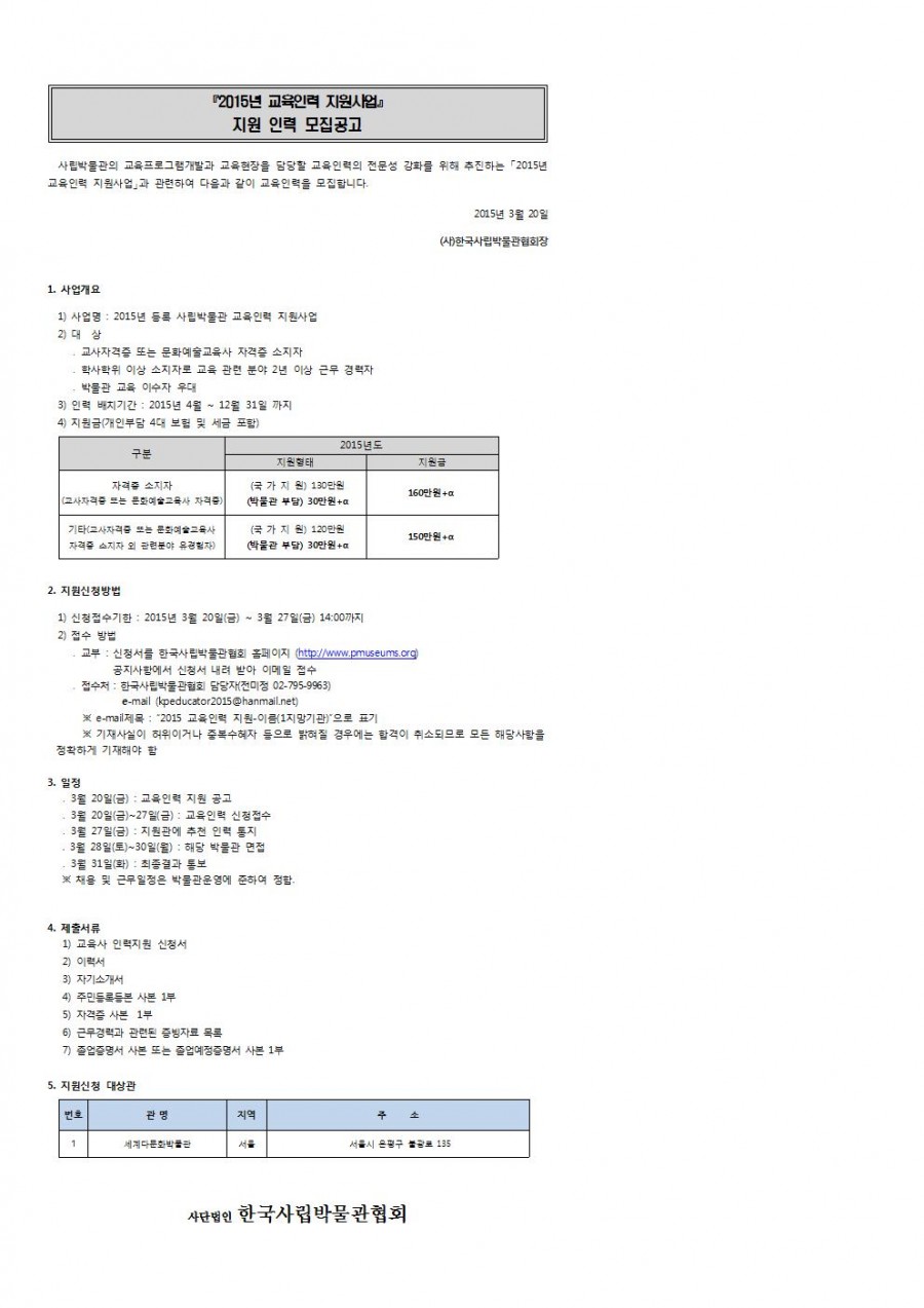 2015년 교육인력 지원사업 지원인력 모집공고(세계다문화박물관)