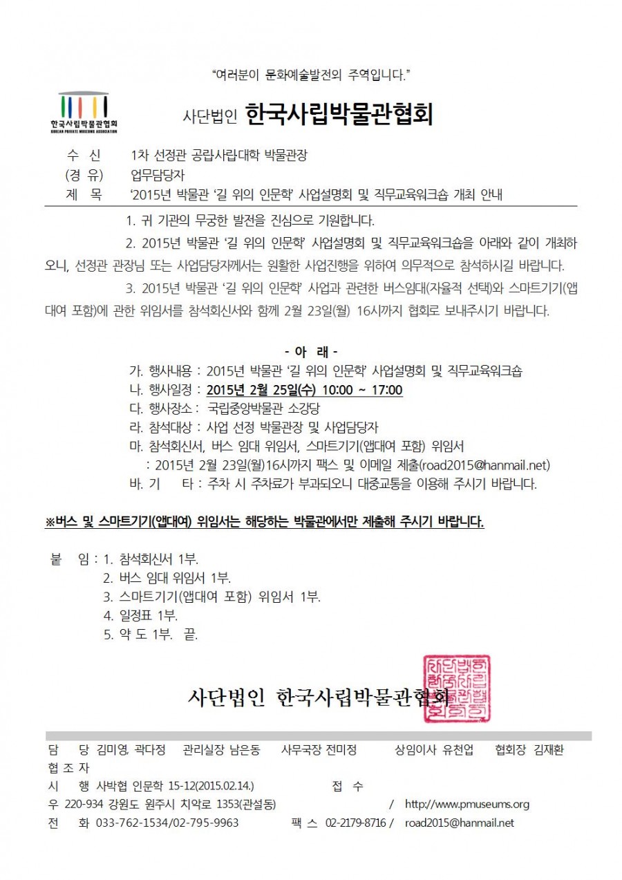 2015 박물관 ‘길 위의 인문학’ 사업설명회 및 직무교육워크숍 개최 안내 페이지 정보 작성자 관리자 작성일15-02-25 15:16 조회41,702회 댓글0건 관련링크 이전글 다음글 목록 본문 댓글목록 등록된 댓글이 없습니다. 이전글 다음글 목록