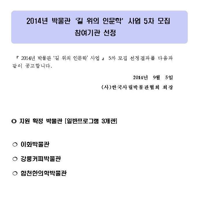 2014 박물관 길 위의 인문학 5차 기관모집 선정결과발표 페이지 정보 작성자 관리자 작성일14-09-05 14:34 조회40,498회 댓글0건 관련링크 이전글 다음글 목록 본문 댓글목록 등록된 댓글이 없습니다. 이전글 다음글 목록