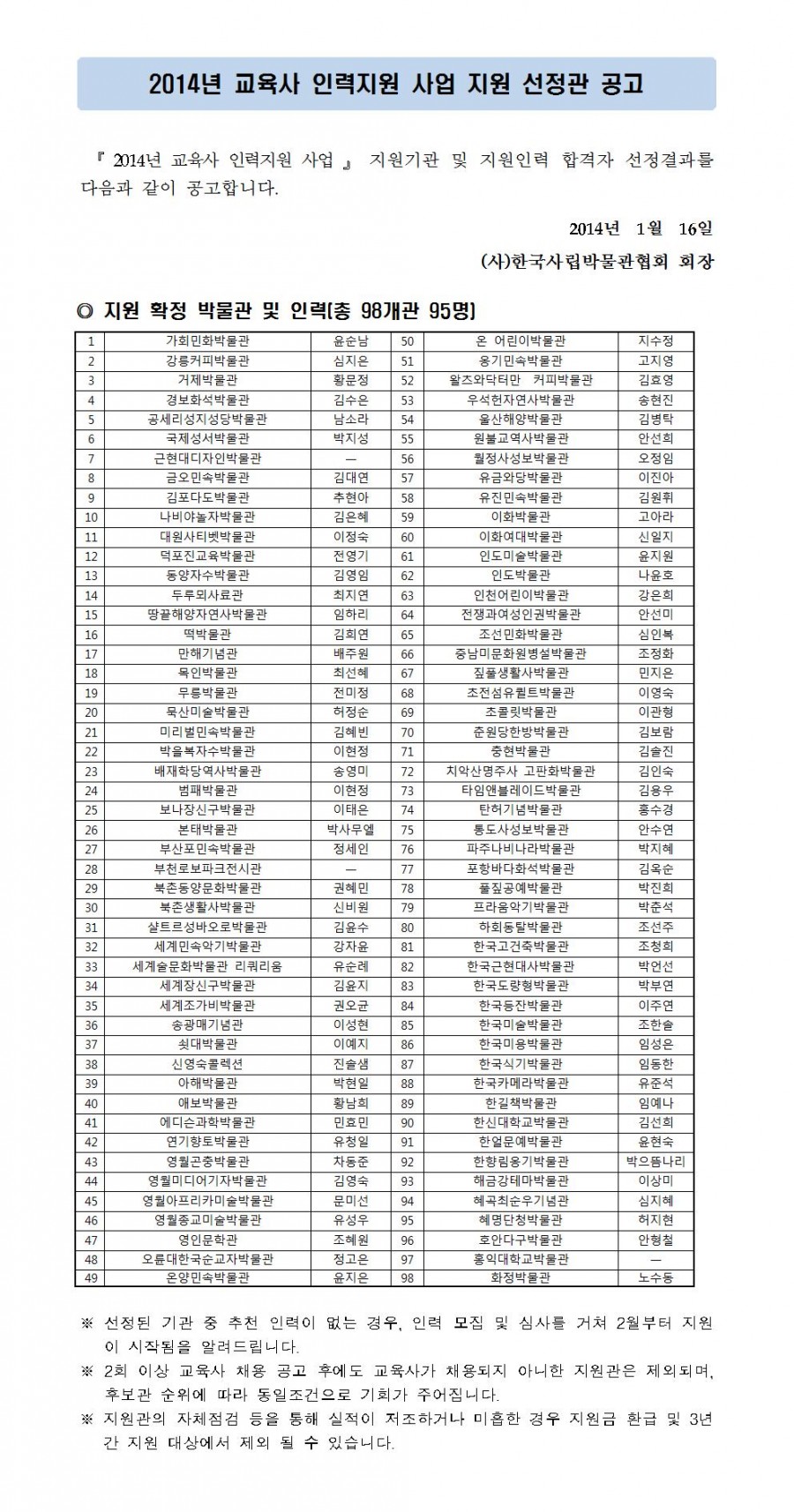 『 2014년 교육사 인력 지원사업 』 지원기관 선정 공고 페이지 정보 작성자 관리자 작성일14-01-16 14:05 조회37,815회 댓글0건 관련링크 이전글 다음글 목록 본문 댓글목록 등록된 댓글이 없습니다. 이전글 다음글 목록