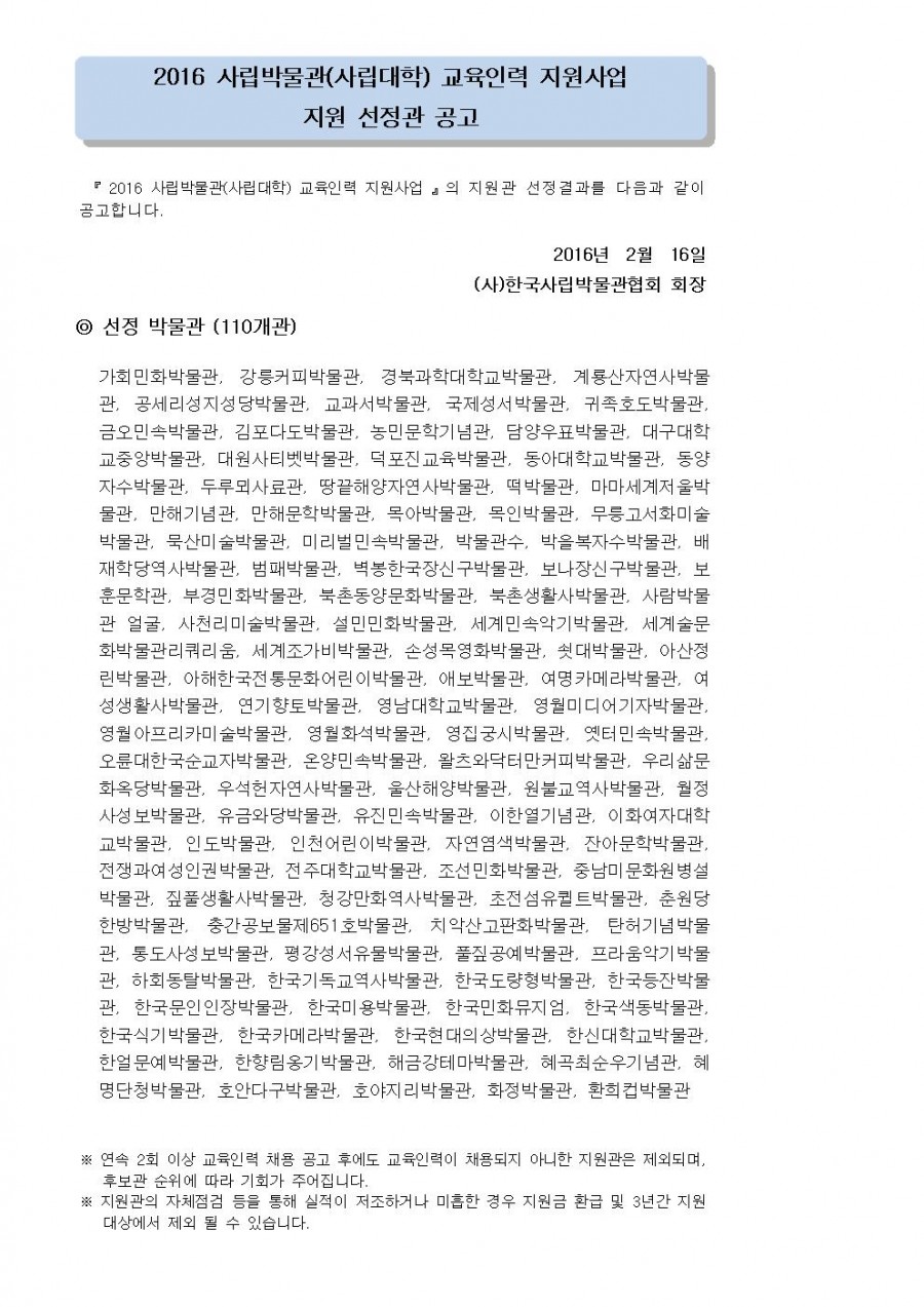 2016 사립박물관(사립대학) 교육인력 지원사업 지원 선정관 공고 페이지 정보 작성자 관리자 작성일16-02-16 19:53 조회42,843회 댓글0건 관련링크 이전글 다음글 목록 본문 댓글목록 등록된 댓글이 없습니다. 이전글 다음글 목록