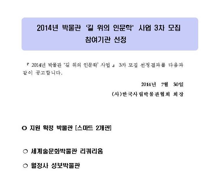 [인문학] 2014 박물관 길 위의 인문학 3차 기관모집 선정결과발표 페이지 정보 작성자 관리자 작성일14-07-30 14:31 조회39,393회 댓글0건 관련링크 이전글 다음글 목록 본문 댓글목록 등록된 댓글이 없습니다. 이전글 다음글 목록
